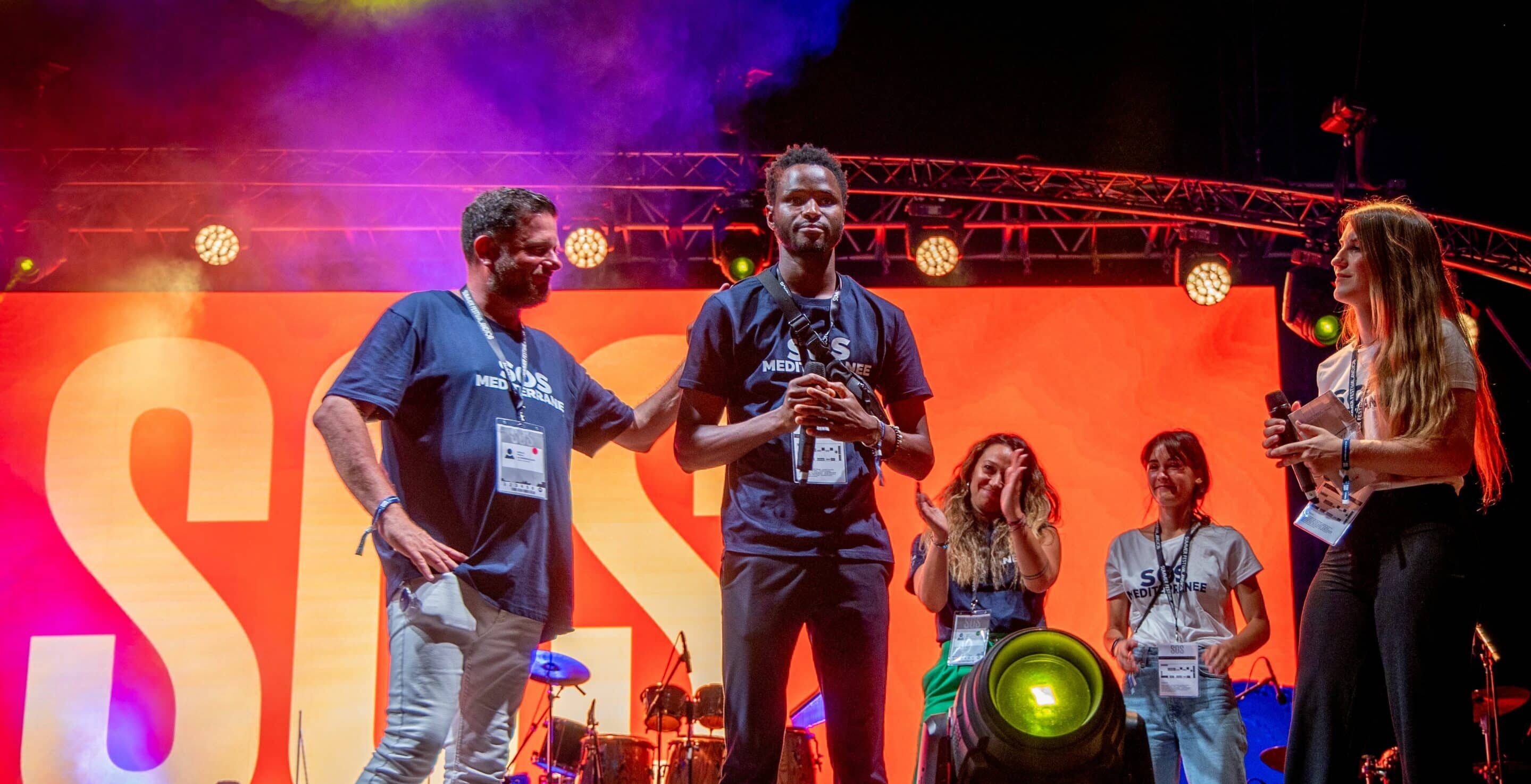 Les milliers de spectateur.ice.s présent.e.s ont longuement acclamé Moussa après qu’il eût pris la parole, suscitant l’émotion et mettant en valeur l’engagement des deux autres membres de SOS MEDITERRANEE présents.es sur scène, comme les nombreux.euses et invisibles mais indispensables bénévoles qui constituent cette chaîne de solidarité. Lui, avait l’air un peu perdu dans ses souvenirs : sans doute défilaient dans sa tête des images de la traversée du désert à l’arrière d’un pick-up, ou de l’embarquement de nuit, sous la contrainte et dans les cris étouffés sur une embarcation pneumatique surchargée.