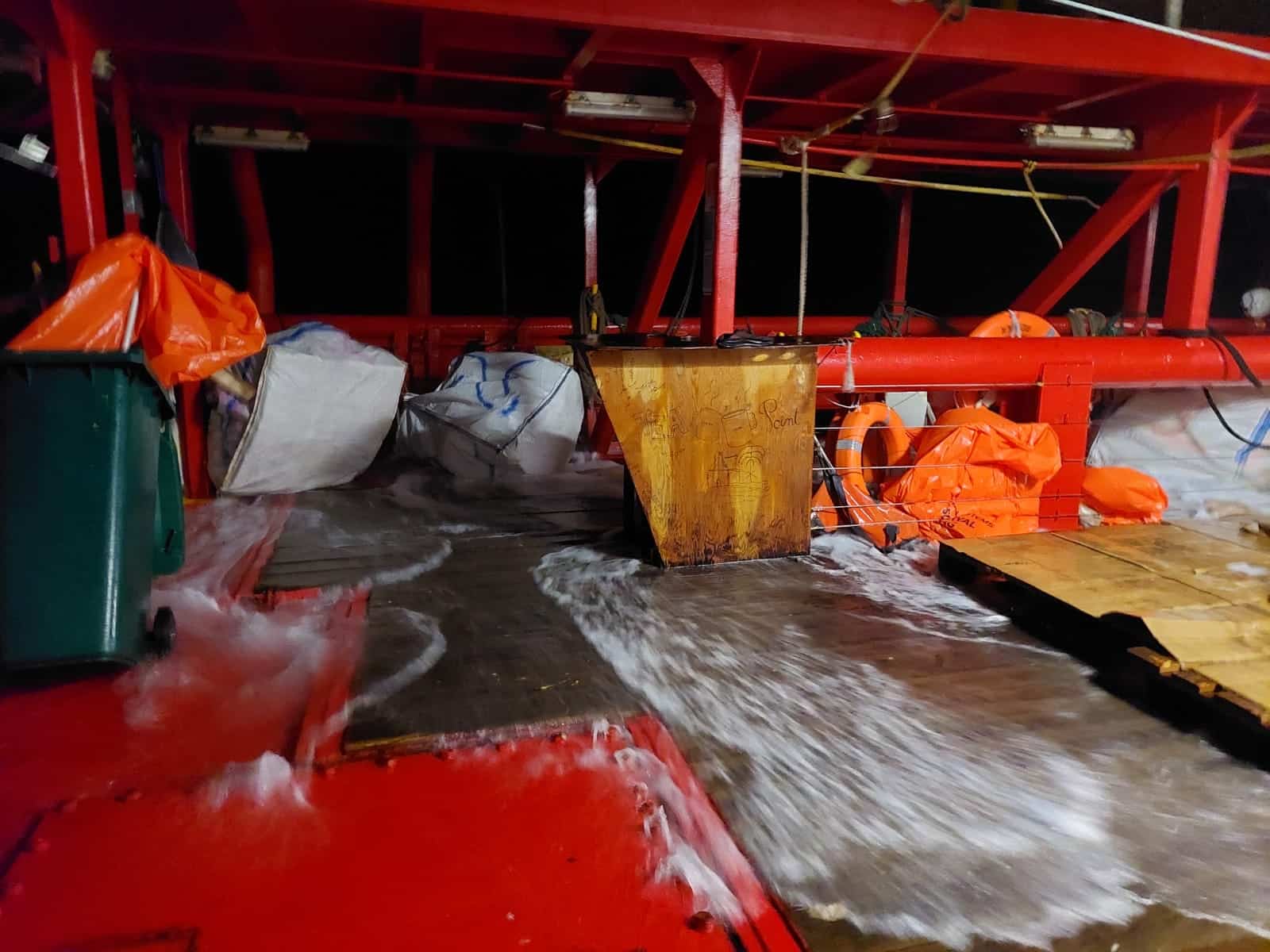 Quelques jours plus tard, alors que nous voguions en pleine nuit, des vagues de quatre mètres se sont mises à frapper l’Ocean Viking. Ces masses d’eau balayaient le pont en bois du navire sur lequel se trouvaient plus de 300 personnes secourues au cours de quatre sauvetages. Les rescapé.e.s qui y dormaient se sont réveillé.e.s complètement trempé.e.s, glissant sur la surface mouillée. Toute la nuit, circulant entre ces personnes, nous nous sommes relayé.e.s. pour leur fournir des couvertures sèches, des vêtements et des bonnets de laine. A l’aube, la mer s’est enfin calmée.
