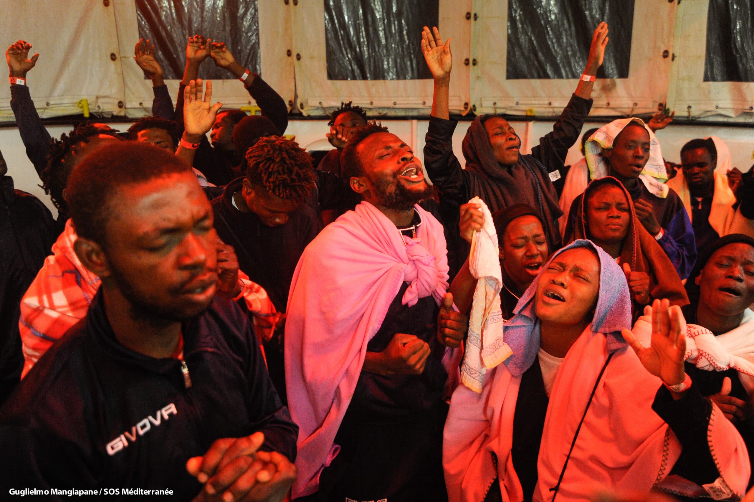 « Il est 21h43. Au loin, j’entends des chants, le chœur semble s’élever depuis la poupe de l’Aquarius. J’attrape mon appareil photo et je cours sur le pont. Ils sont là, réunis en cercle, à chanter, prier, célébrer ensemble. Nous les avons secourus à peine quelques heures plus tôt. « Nous célébrons la vie » me disent-ils. « Nous remercions Dieu d’être encore en vie et nous le remercions de nous avoir envoyé l’Aquarius pour nous sauver alors que nous croyions que tout était fini… nos prières sont aussi pour nos frères restés en Libye ».