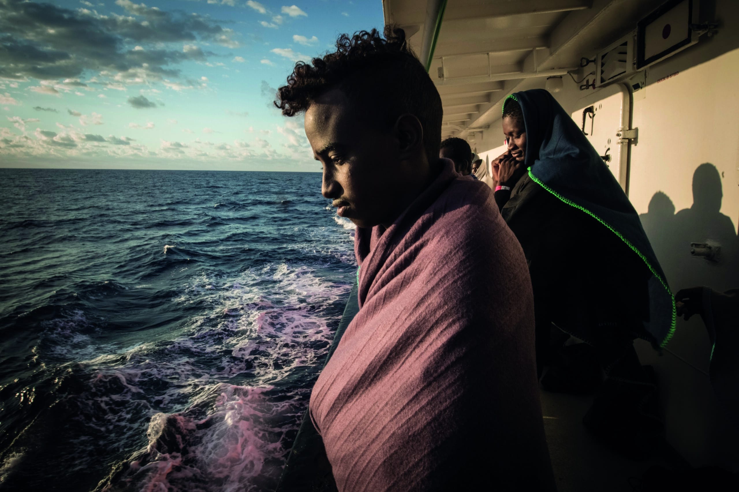 Je ne savais rien des bateaux qui partaient pour l’Europe car j’étais venue en Libye pour travailler. Mais une nuit une bombe a été lancée sur la maison où je vivais, et des hommes sont venus nous prendre pour nous amener à l’endroit d’où les bateaux partent. C’était la nuit et je ne voyais rien sauf le bateau pneumatique blanc dans lequel nous étions. Je me souviens qu’il y avait beaucoup d’autres filles avec moi. Je n’ai payé pour rien, je n’avais pas d’argent. La femme arabe pour qui j’avais travaillé en Libye avait dû payer pour mon voyage. J’ai demandé où nous allions et ils m’ont dit qu’on allait en Europe. Au début je n’avais pas peur car je ne pouvais rien voir. Mais quand le soleil s’est levé, j’ai été terrifiée de me retrouver au milieu de la mer. J’ai vu les autres pleurer, vomir, prier. Je n’ai pas bougé, je voulais pleurer mais j’avais trop peur de tomber à l’eau. J’étais paralysée par la peur.”
