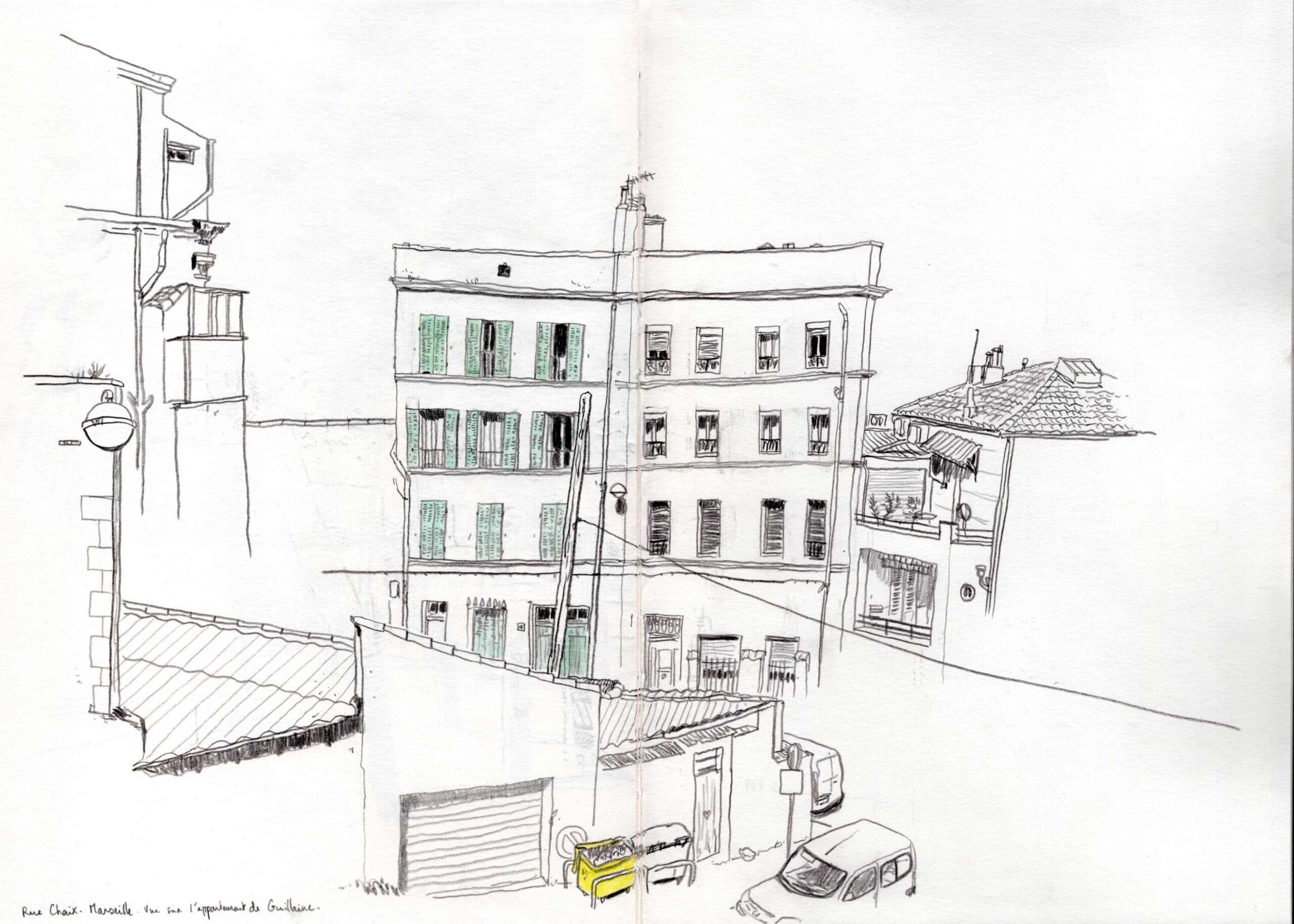 La lumière filtre à travers les pins, qui m’offrent une ombre salvatrice pour dessiner la rue et les immeubles, plongeant en cascade vers le Vieux Port.