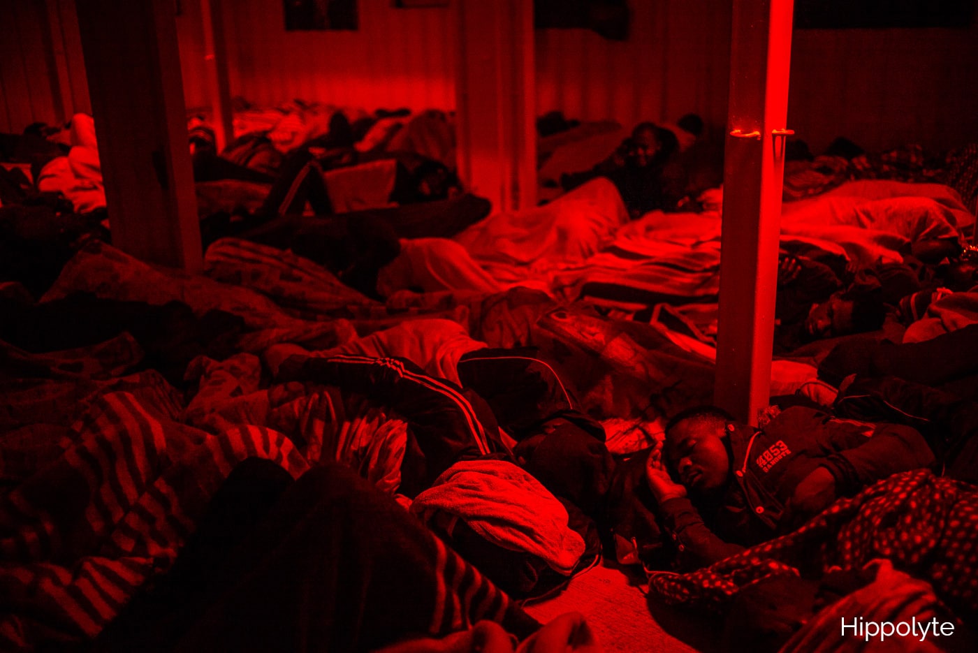 La nuit se prolonge. Tout le monde dort malgré le froid. Je me pose sur le pont qui ressemble à une immense rivière orange. Constituée de corps entassés. Blottis sous les couvertures de survie. Infranchissable. Erik et Riad sont de surveillance pour la nuit. Je reste en bordure de rivière avec eux. En observation. Sous chaque couverture se trouve un corps, une histoire, une vie. La houle est plus forte que jamais. Le navire vacille. Comme nos émotions. Le froid lui, s’infiltre partout. Un immense besoin de chaleur et de réconfort. Erik me regarde dessiner. « Amazing! Amazing! » Besoin de contrebalancer. Salutaire envolée. L’expérience des grands hommes. Savoir à quel moment appuyer.