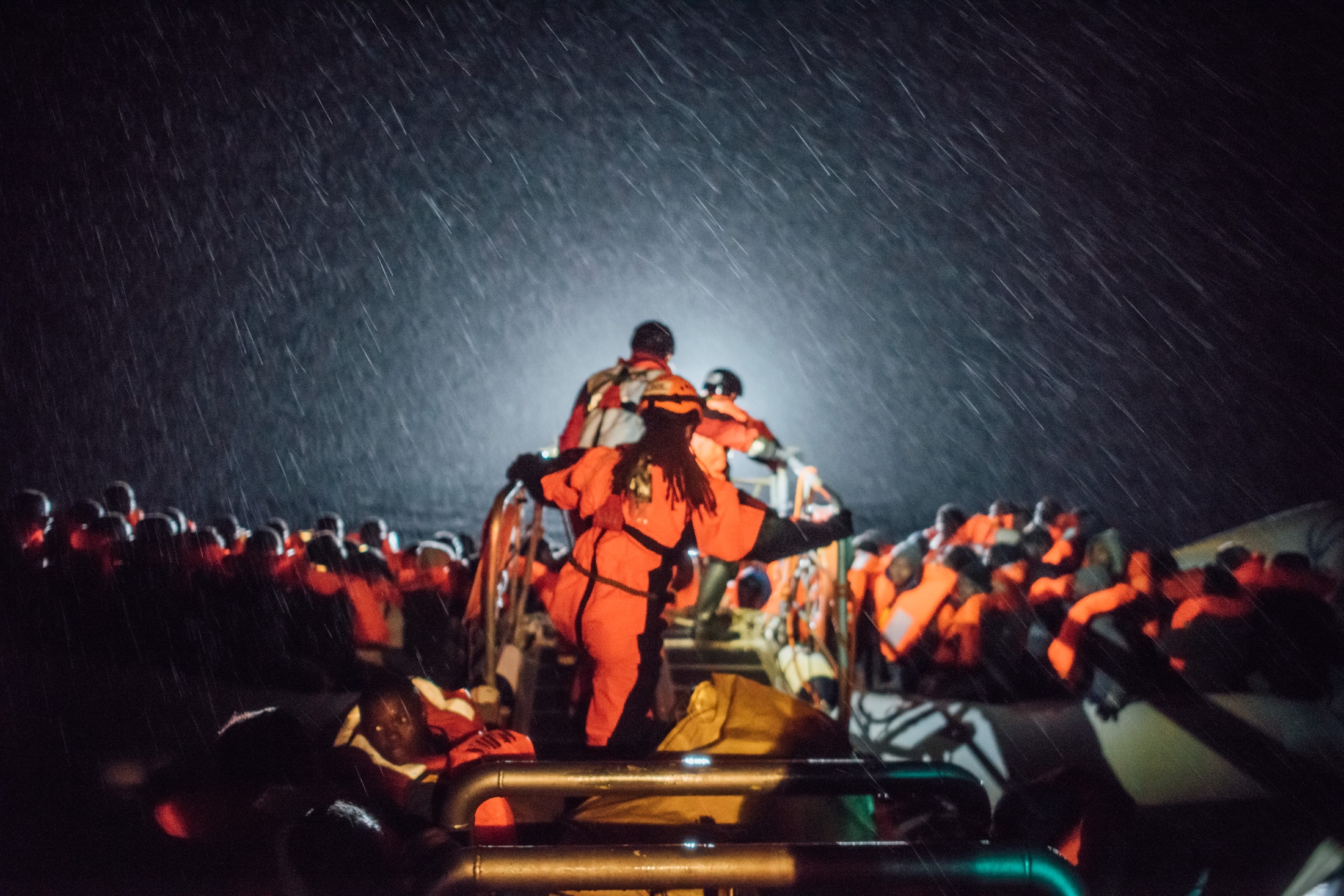 A 17H30, SOS MEDITERRANEE repère et procède, dans l’obscurité, sous une pluie battante et une mer agitée, au sauvetage de 112 personnes, venant du Sénégal et de la Côte d’Ivoire, du Mali, du Nigéria, de la Gambie et du Cameroun. On compte 87 hommes, 25 femmes dont 23 sont seules, 32 mineurs, dont un enfant de moins de 4 ans. 24 de ces mineurs sont non accompagnés. Selon les équipes médicales de MSF à bord, toutes sont en bonne santé.