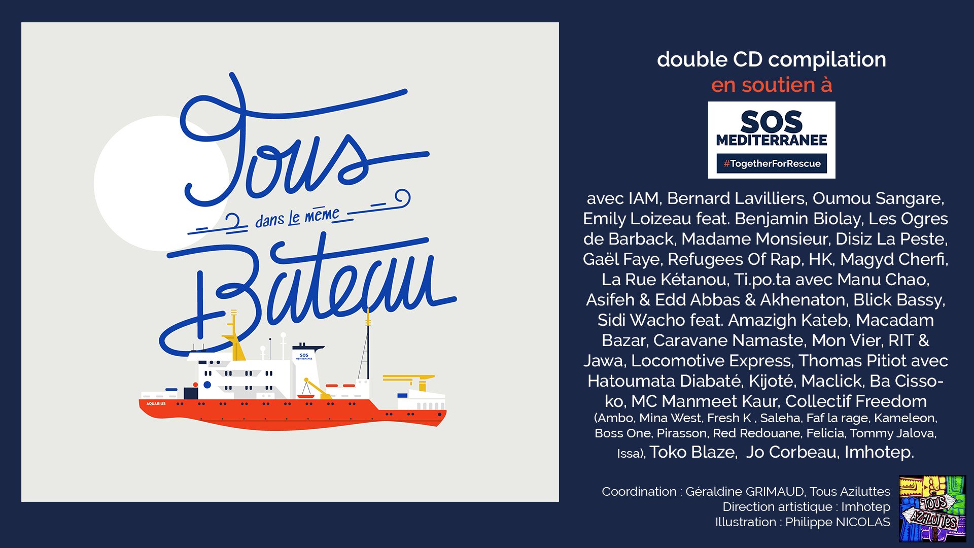L’association Tous Aziluttes sort en septembre 2018 un double CD compilation, élaborée avec l’aide de l’artiste Imhotep du groupe IAM, en soutien à notre association de sauvetage en mer SOS MEDITERRANEE. La compilation « Tous dans le même Bateau » compte une série de trente titres, tous offerts par plus de soixante-dix artistes, parmi lesquels Bernard Lavilliers, Oumou Sangaré, Disiz la Peste, Madame Monsieur, IAM, Gaël Faye, Manu Chao, Emily Loizeau…